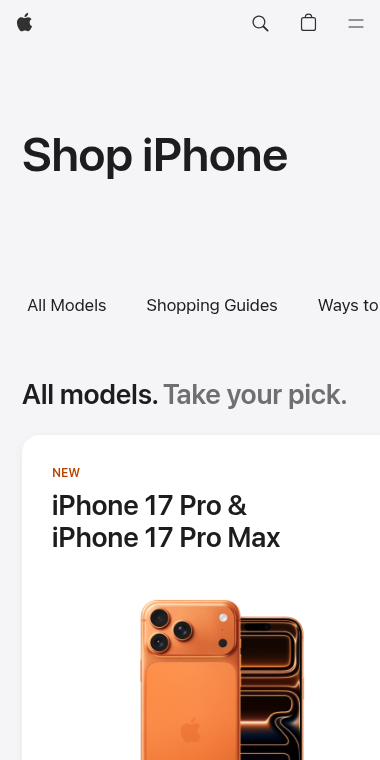 This is Apple's official storefront for buying iPhones. It's a clean, simple page designed to get you the exact phone you want without any fuss.