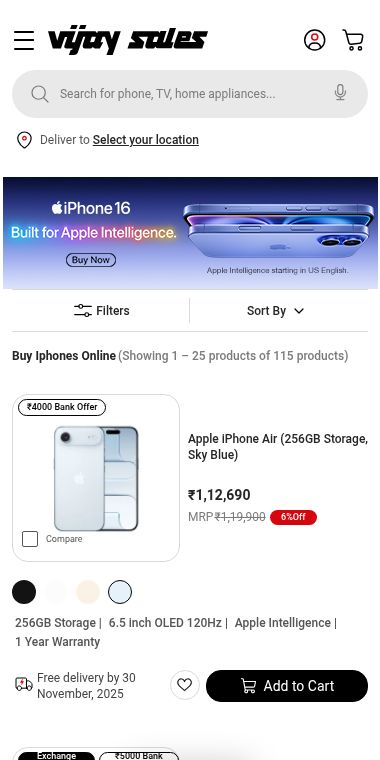 Vijay Sales' iPhone page is a clean and straightforward online storefront. It feels like walking into a well-organized electronics showroom, making it easy to browse and compare different iPhone models without any clutter or fuss.