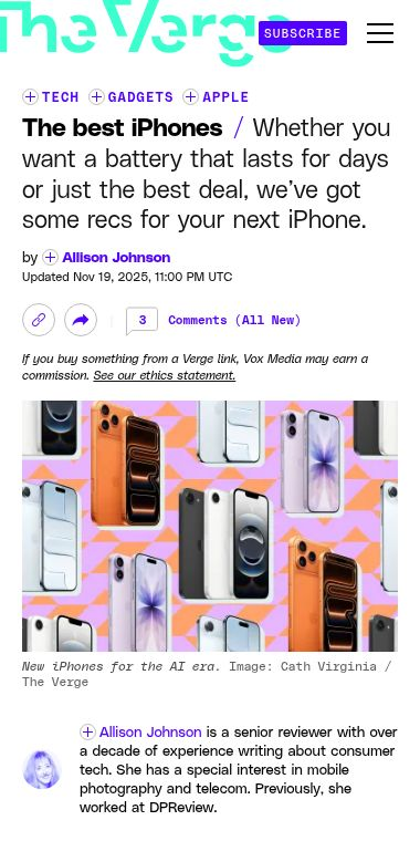 h2: Tech,Gadgets,Apple,Allison Johnson,Allison Johnson,Featured Products,What we’re looking for,The best iPhone for most people,The best high-end iPhone,The iPhone with the best battery life,The best iPhone for people who hate bulky phones,The best inexpensive-ish iPhone,What’s coming next,Allison Johnson,Apple,Buying Guides,Gadgets,iOS,iPhone,Mobile,Tech,Verge Shopping,Most Popular,Verge Deals,More in Tech,Top Stories