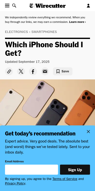h1: Which iPhone Should I Get? h2: The research,When should you upgrade if you have an older iPhone?,The best all-around package: iPhone 17,The best cameras: iPhone 17 Pro and iPhone 17 Pro Max,A more affordable option: iPhone 16e,The competition,Meet your guide,Further reading nav_tags: BROWSE,Sections in this article content: