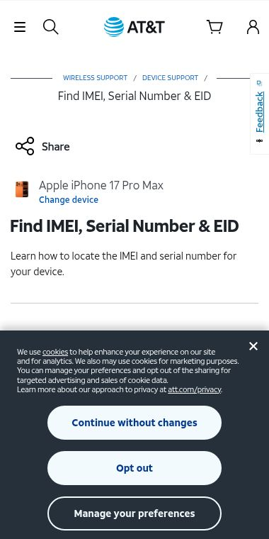 GET APPLE IPHONE 17 PRO MAX SUPPORT FOR THE TOPIC: FIND IMEI, SERIAL NUMBER & EID. FIND MORE STEP-BY-STEP DEVICE TUTORIALS ON ATT.COM. for Checking iPhone IMEI serial number at att.com