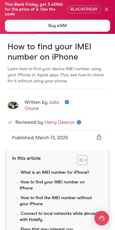 h2: What is an IMEI number for iPhone?,How to find your IMEI number on iPhone,How to find the IMEI number without your iPhone,Connect to local networks while abroad with Holafly,Plans that may interest you,Julio Osuna