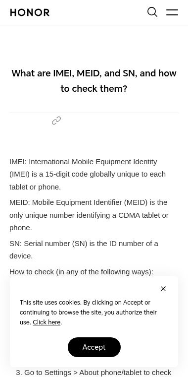 WHAT ARE IMEI, MEID, AND SN, AND HOW TO CHECK THEM? IMEI: INTERNATIONAL MOBILE EQUIPMENT IDENTITY (IMEI) IS A 15-DIGIT CODE GLOBALLY UNIQUE TO EACH TABLET OR PH... for Checking iPhone IMEI serial number at honor.com