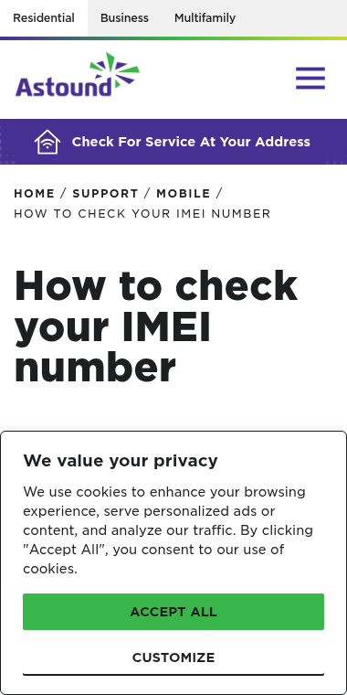 This is a super handy support page from Astound Mobile. It's a straightforward guide to help you locate a unique code for your phone, which is way more useful than it sounds.