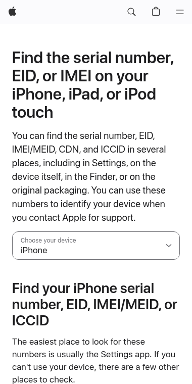 h2: Find your iPhone serial number, EID, IMEI/MEID, or ICCID,More ways to find your device's serial number, EID, or IMEI/MEID,Apple Footer