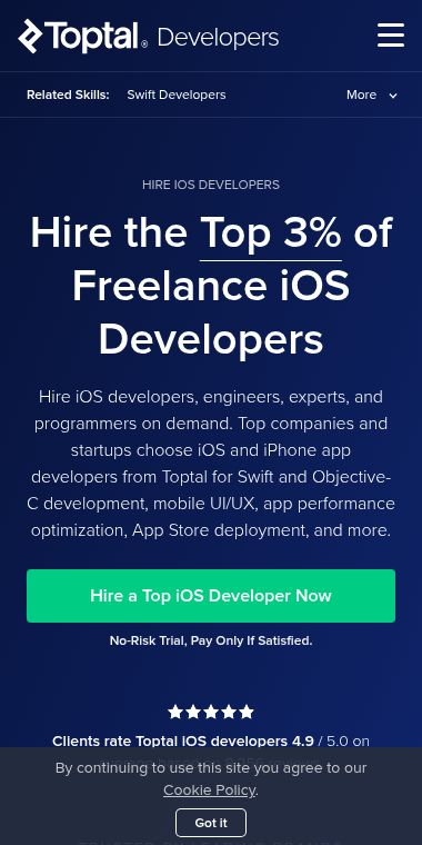 This is the iOS developer hub from Toptal, a platform known for connecting companies with top-tier freelance software engineers. It’s basically a specialized landing page designed to show you why and how you can hire a vetted iOS expert for your project.