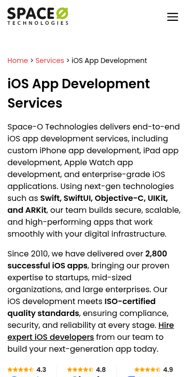h2: iOS App Development Services We Offer for Businesses,Why Native iOS App Development Services Are the,Our iOS App Development Process,Best Practices We Follow for Custom iOS App Development,Our Custom iOS App Development Portfolio,Our iOS App Solutions Recognized & Featured In,Technology Stack We Use for iOS App Development Services,Why Choose Space-O Technologies as Your Trusted,Clients Love Space-O Technologies,Top iOS App Development Companies Reviews,FAQs About iOS App Development Services