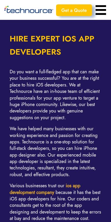 Specifically, this page details their iOS development hiring services. You can learn about their process, the specific skills their developers possess (like Swift and Objective-C), and the types of apps they can build for you. It also has a form to contact them and start a project.