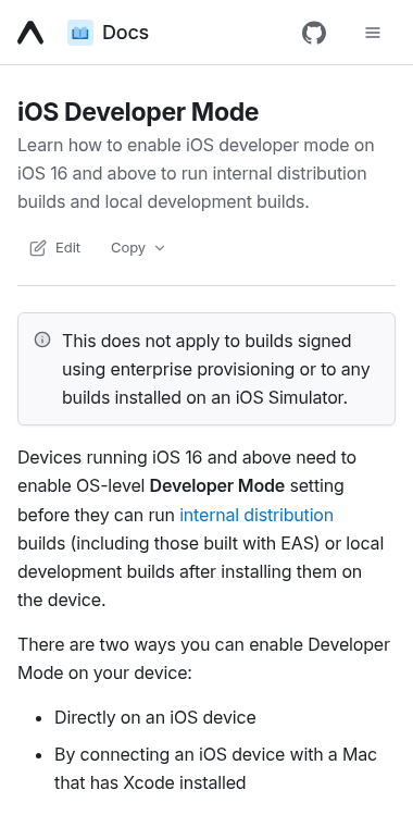 LEARN HOW TO ENABLE IOS DEVELOPER MODE ON IOS 16 AND ABOVE TO RUN INTERNAL DISTRIBUTION BUILDS AND LOCAL DEVELOPMENT BUILDS. for For iPhone developers at docs.expo.dev