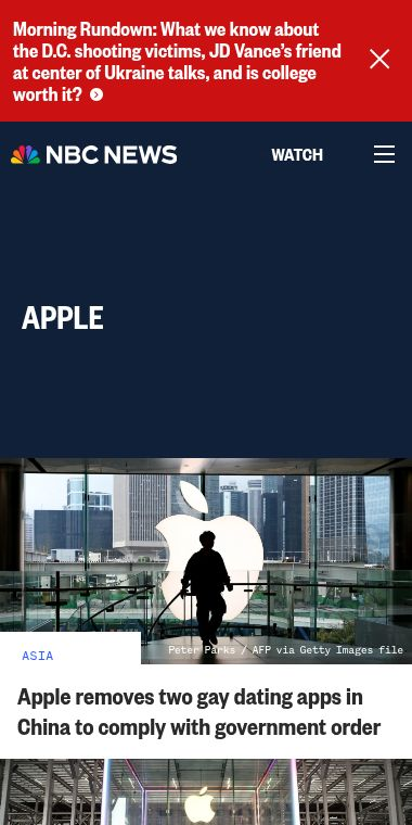 h2: Asia,Apple removes two gay dating apps in China to comply with government order,Markets,Apple becomes third company in history to crack $4 trillion market value,Business News,Apple Watch getting redesigned blood oxygen feature following legal dispute,Business News,Musk threatens 'immediate' legal action against Apple over alleged antitrust violations,Apple,Apple unveils software redesign while reeling from AI missteps, tech upheaval and Trump's trade war,Trump tariffs,Trump threatens 25% tariff on Apple, other tech giants if they don't start making devices in America,Asia,Trump says he doesn't want Apple building products in India,NBC News Videos,02:37,02:28,00:44,03:23,03:31,00:58,00:48,00:36,00:41,01:39,19:03,02:00,02:09,02:30,01:56,01:30,01:14,02:06,01:54,01:59,Apple,U.S. judge rules Apple violated order to reform App Store,NBCBLK,Apple shareholders reject ban on diversity programs,Business News,Apple boosts U.S. investment plans with $500 billion pledge amid Trump tariff threat,Apple,Apple to pay $95 million to settle lawsuit accusing Siri of eavesdropping,Artificial intelligence,Apple launches its ChatGPT integration with Siri,Consumer,Apple releases Apple Intelligence. Here's how to get it on your iPhone.,World,Apple and Huawei battle for sales as their new phones launch on the same day in China,World,Huawei's tri-fold phone gets 2.7 million preorders ahead of Apple's iPhone 16 launch,Consumer,U.S. news,Business News,Consumer,Markets,Tech News,Apple's new AI update aims to create an iPhone that truly gets you,Live Updates,Apple WWDC 2024: Apple Intelligence is here with ChatGPT integration,Tech News,Apple faces backlash for 'destructive' iPad ad featuring machine crushing books and instruments,Apple,Apple announces new iPad Pro with M4 chip, new iPad Air tablets,Business News,Apple loses top phonemaker spot to Samsung as iPhone shipments drop, research company says,Business News,Jon Stewart claims Apple discouraged him from interviewing FTC Chair Lina Khan,Apple,Apple faces years of distractions after DOJ antitrust suit,Business News,Apple hit with major DOJ lawsuit alleging its iPhone ecosystem is an illegal monopoly,World,Apple CEO Tim Cook visits Shanghai amid a slowdown in China iPhone sales,Tech News,Apple reverses course and clears way for Epic Games to set up rival iPhone app store in Europe,Business News,Apple hit with more than $1.95B E.U. antitrust fine over music streaming,Apple,Apple releases new sports app for iPhone