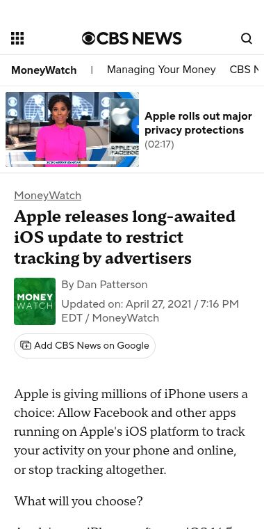 This CBS News article dives into a major change Apple made to its iPhones, giving users more control over their data. It explains the new privacy features in a way that's easy for everyone to understand, not just tech experts.