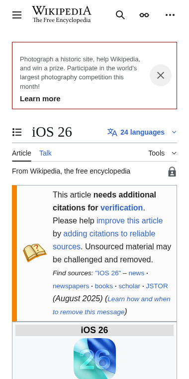 This Wikipedia page is all about iOS 26, the future version of Apple's mobile operating system for iPhones. It's the go-to spot for getting the early scoop on what Apple might be cooking up next.