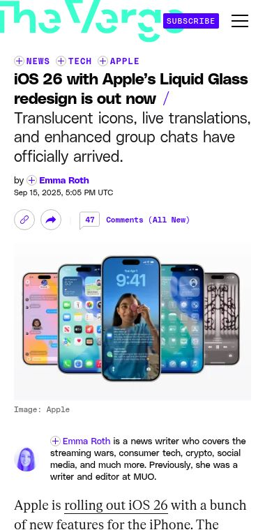 APPLE HAS LAUNCHED IOS 26, BRINGING SEVERAL NEW FEATURES TO THE IPHONE, INCLUDING ITS LIQUID GLASS REDESIGN, LIVE TRANSLATIONS, AND ENHANCEMENTS FOR GROUP CHATS. for iOS news at theverge.com