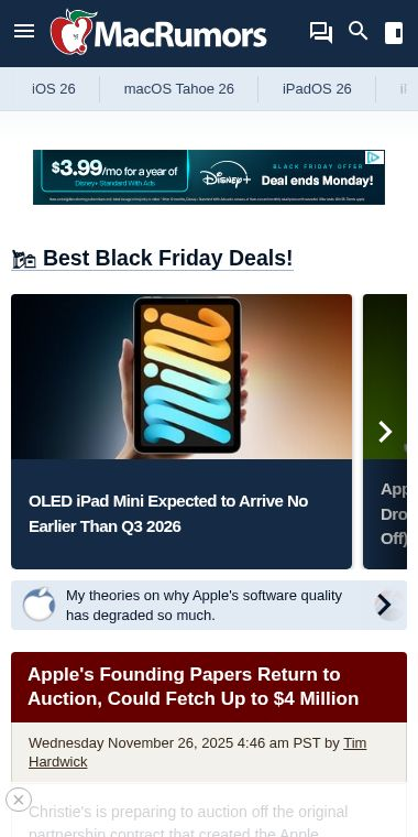h2: 🛍 Best Black Friday Deals!,Apple's Founding Papers Return to Auction, Could Fetch Up to $4 Million,ChatGPT Voice Mode Now Works Inside Your Existing Conversation,iPhone 17 Helps Apple Reclaim Top Spot From Samsung After 14 Years,OLED iPad Mini Expected to Arrive No Earlier Than Q3 2026,Apple Intelligence Expansion to China Progresses With New Feedback Form,Holiday App Festivitas Adds Animated String Lights and Snow Effects to Apple Devices,Satechi FindAll Review: Rechargeable AirTag Alternatives With Find My Support,Amazon Discounts USB-C AirPods Max to $399.99,Popular Brands Including Twelve South and Satechi Kick Off Big Black Friday Sales on Amazon,Black Friday Prices Now Available for Apple Pencil Pro ($94.99), AirTag ($17.97), and iPhone 17 Cases ($25),iPhone Pocket is Now Completely Sold Out Worldwide,Foldable iPhone to Debut These Three Breakthrough Features,Apple's Brand New M5 MacBook Pro Drops to $1,399.99 for Black Friday ($199 Off),MacBook Air With M1 Chip is Now Just $549 at Walmart,Singapore Orders Changes to iMessage by December,Spotify to Raise US Subscription Prices Early Next Year,Huawei Mate 80 Series Debuts With Claim of 8,000-Nit Peak Brightness,Apple Faces Polish Antitrust Probe Over App Tracking Transparency,Guides,Upcoming,Recent Comments,Other Stories,Guides,Upcoming,Recent Comments,Other Stories,Our Staff,Related Links