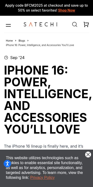 This specific page is a deep dive into the iPhone 16, highlighting its new power and intelligence features. More importantly, it showcases the specific Satechi accessories, like stands, hubs, and chargers, designed to complement the new phone perfectly.
