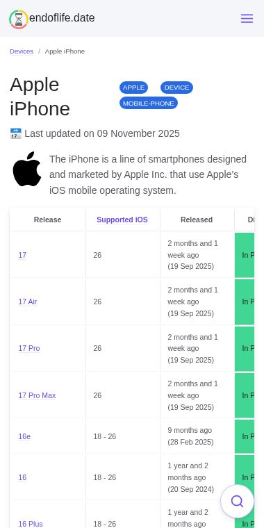 CHECK END-OF-LIFE, RELEASE POLICY AND SUPPORT SCHEDULE FOR APPLE IPHONE. for iPhone device check and information at endoflife.date