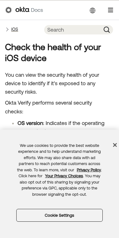 It explains what "Device Health" means and walks you through checking for things like a passcode, iOS updates, and making sure your Okta Verify app is working properly.