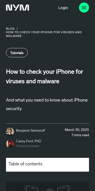 h2: About iPhone security,Can iPhones get viruses?,How to Remove Malware from iPhone,Signs your iPhone might have malware,How to check for malware on iPhone (step-by-step),Final thoughts,About the authors,Table of contents,Go invisible with NymVPN,Keep Reading...,Nym Newsletter