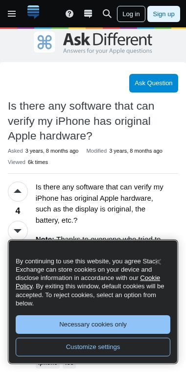 On this specific page, a user asks if there is any software that can verify if their iPhone has original Apple hardware, and the community provides answers and discusses potential methods and apps.