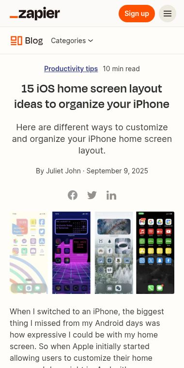 This is a super handy blog post from Zapier that dives into creative ways to organize your iPhone home screen. It’s perfect for anyone looking to move beyond the default app layout and boost their productivity or personalize their device.