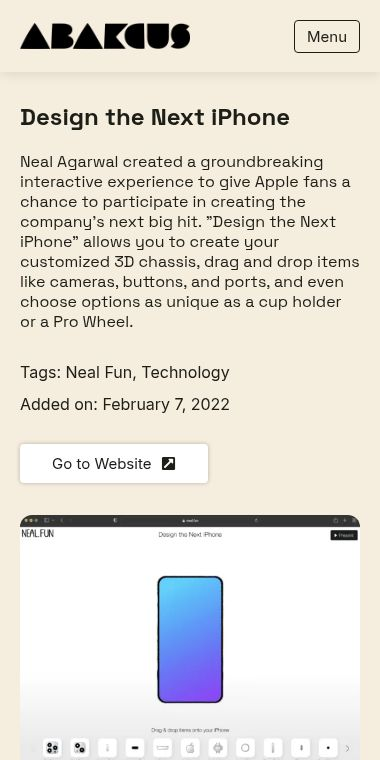 NEAL AGARWAL CREATED A GROUNDBREAKING INTERACTIVE EXPERIENCE TO GIVE APPLE FANS A CHANCE TO PARTICIPATE IN CREATING THE COMPANY'S NEXT BIG HIT. "DESIGN THE NEXT IPHONE" ALLOWS YOU TO CREATE YOUR CUSTOMIZED 3D CHASSIS, DRAG AND DROP ITEMS LIKE CAMERAS, BUTTONS, AND PORTS, AND EVEN CHOOSE OPTIONS AS UNIQUE AS A CUP HOLDER OR A PRO WHEEL. for iPhone entertainment and customization at abakcus.com