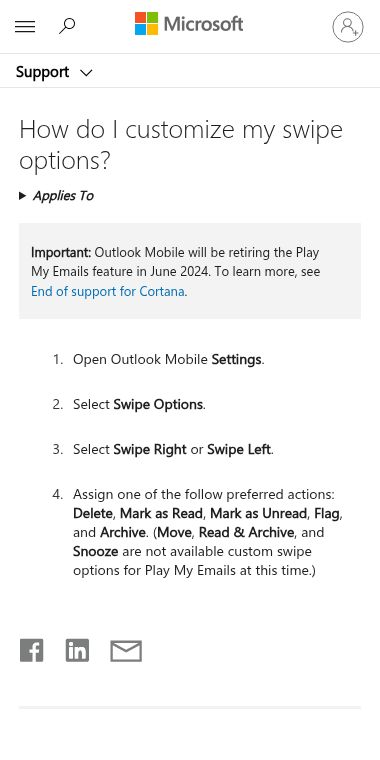 This is a super handy support page from Microsoft that helps you take control of your inbox. If you use the Outlook mobile app, this site shows you how to change what happens when you swipe left or right on emails, making your workflow way faster.