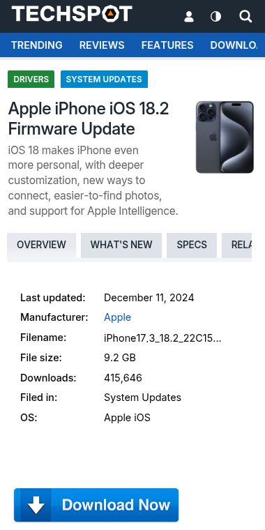 DOWNLOAD APPLE IPHONE IOS 18.2 FIRMWARE UPDATE. OS SUPPORT: APPLE IOS. CATEGORY: SYSTEM UPDATES for iPhone firmware at techspot.com