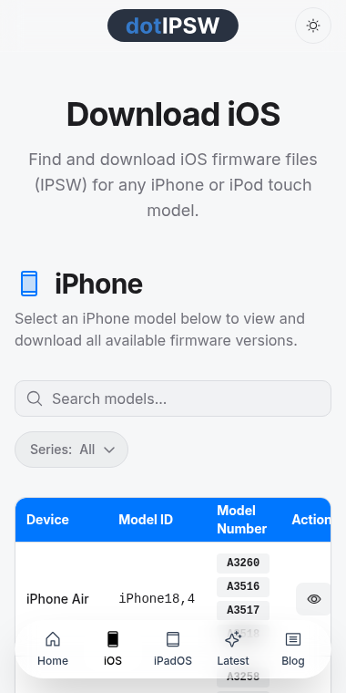 Here, you can directly download the exact IPSW firmware file you need. Just find your device model and pick from a huge list of available iOS versions, from the latest releases all the way back to much older ones.