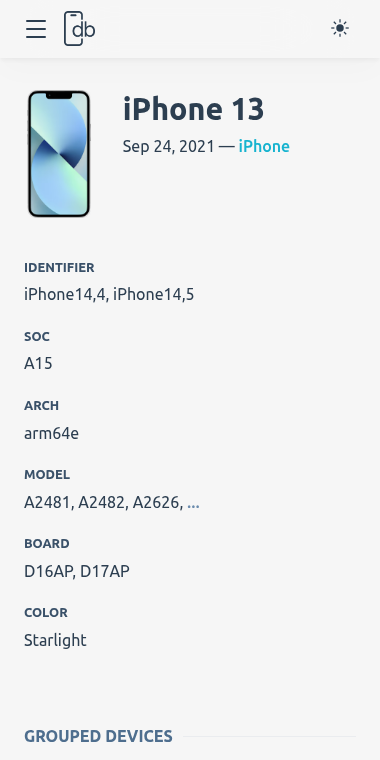On this specific page, you'll find a complete breakdown of the entire iPhone 13 lineup. It lists every model, their internal identifiers, and detailed specs for hardware, software, and even the different color options available at launch.