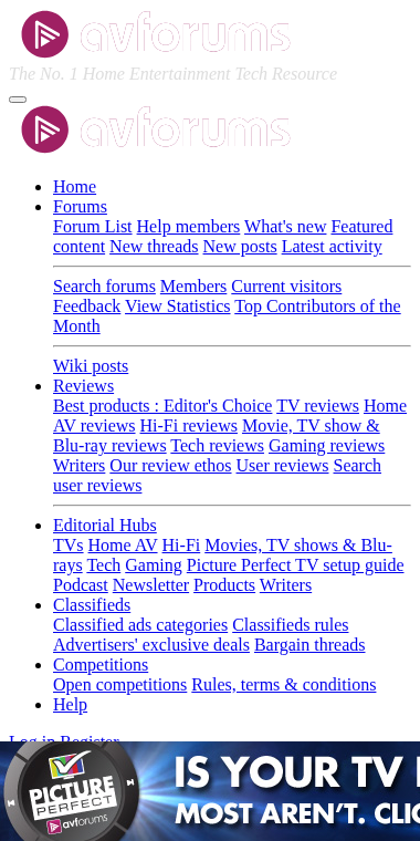 nav_tags: ,,,,,,,,Home,,,Forums,,,Forum List,Help members,What's new,Featured content,New threads,New posts,Latest activity,Search forums,Members,Current visitors,Feedback,View Statistics,Top Contributors of the Month,Wiki posts,,,Reviews,,,Best products : Editor's Choice,TV reviews,Home AV reviews,Hi-Fi reviews,Movie,TV show & Blu-ray reviews,Tech reviews,Gaming reviews,Writers,Our review ethos,User reviews,Search user reviews,,,Editorial Hubs,,,TVs,Home AV,Hi-Fi,Movies,TV shows & Blu-rays,Tech,Gaming,Picture Perfect TV setup guide,Podcast,Newsletter,Products,Writers,,,Classifieds,,,Classified ads categories,Classifieds rules,Advertisers' exclusive deals,Bargain threads,,,Competitions,,,Open competitions,Rules,terms & conditions,,,Help,,,,Log in,,Register,,,What's new,,,Search,,,Search,,,Everywhere,Threads,This forum,,Search titles only,,Note,,,By:,,,Search,Advanced search…