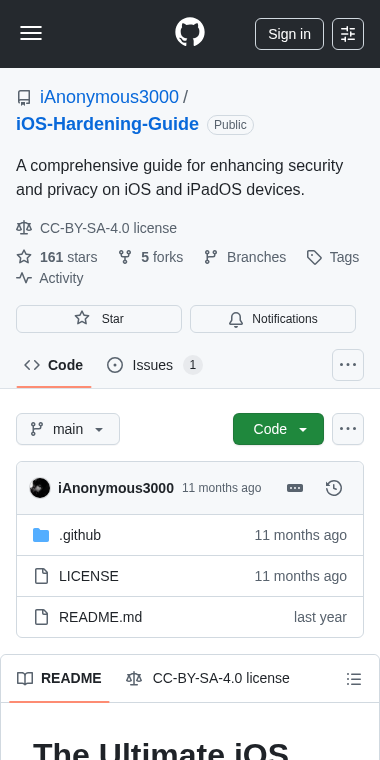 h2: Navigation Menu,Use saved searches to filter your results more quickly,Folders and files,Latest commit,History,Repository files navigation,Table of Contents,Introduction,Choosing the Right Device: Device Selection and Biometric Security,Purchasing iOS Devices Anonymously,Initial Setup and Apple ID: Best Practices,Passcodes and Encryption,Enable Find My,Enable Automatic Updates,Two-Factor Authentication,Optimizing Tracking and Location Services,Advanced Location Services and Tracking: Disabling for Privacy,Biometric ID Considerations and Legal Implications,Enhancing Lock Screen Security,Disable Control Center when locked,Enable Stolen Device Protection,Managing App Permissions,Disabling Tracking and Ad Tracking,Using VPN and Firewall for Enhanced Security,VPN and DNS Configurations for Enhanced Privacy,Privacy-Focused Alternatives to Apple Apps,Secure Messaging Apps,Privacy-focused Browsers,Secure Email Providers,App Sandboxing,Secure Wireless Connections,Threat Modeling,Security Auditing Tools,Siri Privacy Settings,Securing iCloud Settings,Safari Privacy and Security Settings,Detailed Privacy Settings Adjustments,Staying Secure with iOS Updates,Physical Security Measures for Your Device,The Risks of Jailbreaking,Secure Backups,Alternatives to Data Transfer and iCloud,Screen Time & Restrictions for Added Security,Optimizing System Services for Privacy,Understanding and Using Lockdown Mode,Learn to Use Emergency SOS,Enable USB Restricted Mode,Managing Emergency Alerts and Addressing False Privacy Warnings,Password Management and Account Security,Privacy Implications of iCloud Backups,Threat Modeling Scenarios,Securely Disposing of Old Devices,Privacy Trade-offs of Find My,Securely Using Apple Pay and Wallet Features,Educating Family and Friends about Secure Practices,Managing IoT Devices and Their Access,Contextualizing Jailbreaking Risks,Regular Updates and Revisions,External Resources for Further Learning,Feedback and Contributions,About,Sponsor this project,Footer
