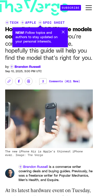 h2: Tech,Apple,Spec Sheet,Brandon Russell,Brandon Russell,iPhone 17 spec comparison,Verge Deals,Brandon Russell,Apple,iPhone,Spec Sheet,Tech,More in this stream,Most Popular,The Verge Daily,More in,Top Stories