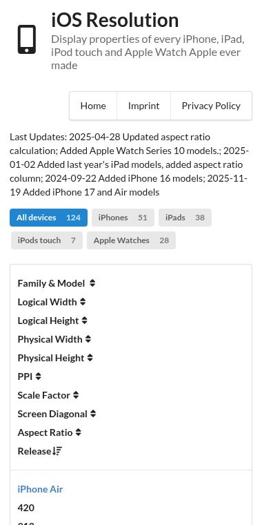 You can find a complete, sortable table with every iPhone, iPad, and Apple Watch model, listing their screen resolutions, point sizes, pixel densities (PPI), and even aspect ratios. It’s perfect for checking specs on the fly.
