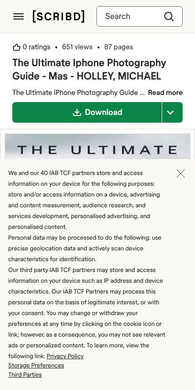 Specifically, you can find "The Ultimate iPhone Photography Guide" by Michael Holley here. The page shows a preview of the document, its description, and options to download or save it, giving you a solid look before you commit.