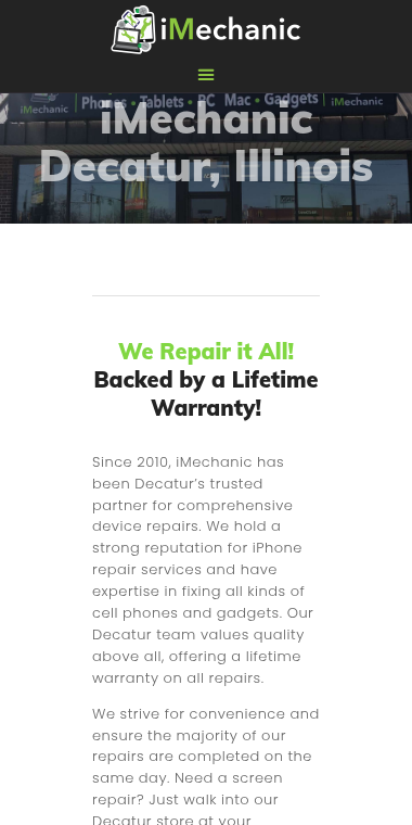 IMECHANIC IS EXCITED TO BE IN DECATUR FIX PHONE MARKET. WE TAKE DECATUR IPHONE REPAIR & DECATUR PHONE REPAIR SERVICES SERIOUSLY. REPAIRS COME WITH A LIFETIME WARRANTY AND DECATUR CELLPHONE REPAIR SERVICES ARE COMPLETED SAME-DAY. IN NEED OF A DECATUR SCREEN REPAIR TODAY? STOP BY ANYTIME. for iPhone repair at imechanic.com
