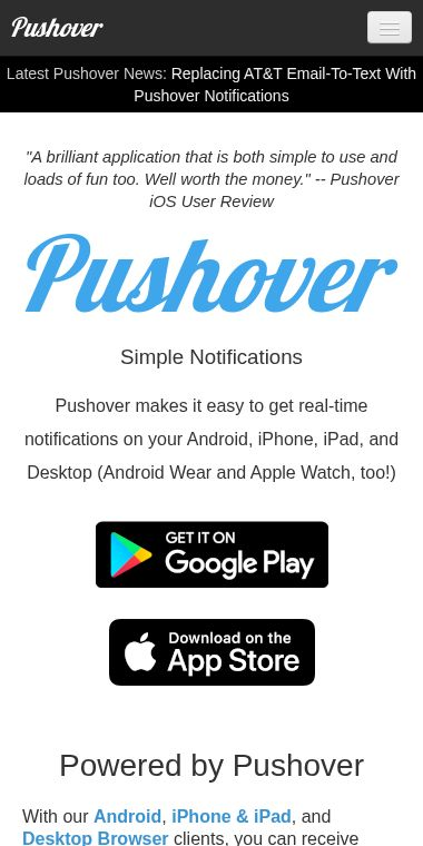 On this page, you can sign up for an account, download the mobile apps, and check out the extensive documentation for developers. It explains how to integrate Pushover with your own software using their simple API, making it a go-to tool for adding push notifications to any project.
