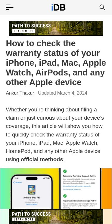 LEARN HOW TO CHECK THE REMAINING WARRANTY COVERAGE OF YOUR IPHONE, IPAD, MAC, APPLE WATCH, HOMEPOD, AND ANY OTHER APPLE DEVICE. for iPhone warranty status at idownloadblog.com