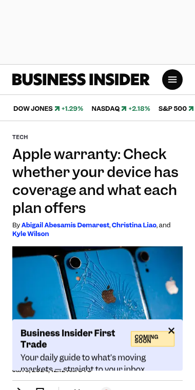 h1: Apple warranty: Check whether your device has coverage and what each plan offers h2: ,,,Related stories,How to check if your Mac is under warranty,How to check if your AirPods are under warranty,Apple Watch, AirPods warranty,Read next,Business Insider First Trade nav_tags: content: