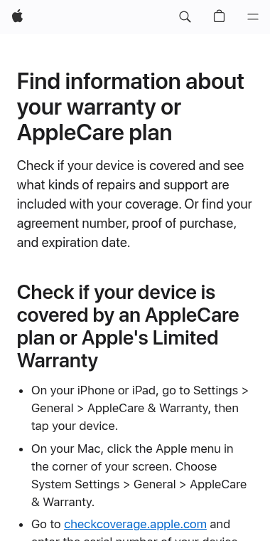 h2: Check if your device is covered by an AppleCare plan or Apple's Limited Warranty,See what your coverage includes and when your coverage expires,Get the agreement number or proof of coverage,Need more help?,Apple Footer