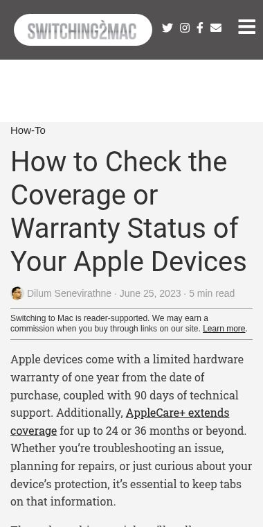 h1: How to Check the Coverage or Warranty Status of Your Apple Devices h2: Check Coverage Through Your Apple Device,Visit Apple’s Check Coverage Website,Go to Apple’s My Support Page,Use the Apple Support App,What About Apple Accessories?,Easily Check the Warranty Coverage of Your Apple Devices,Ready for the best newsletter in tech? nav_tags: Latest,How-To,Social Media,Streaming,Reviews content: