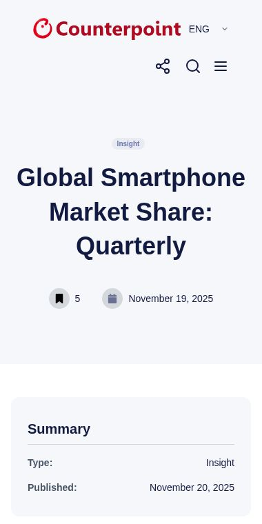 This specific page shows the global market share for different smartphone brands. You can see quarterly data on how companies like Apple, Samsung, and Xiaomi are performing, complete with easy-to-read charts and graphs.