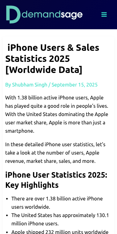 IPHONE HAS 1.38 BILLION USERS. FIND DETAILED INSIGHTS ON IPHONE USERS, SALES, REVENUE, AND OTHER UPDATED DATA INSIDE OUR REPORT. for Major iPhone retailers at demandsage.com