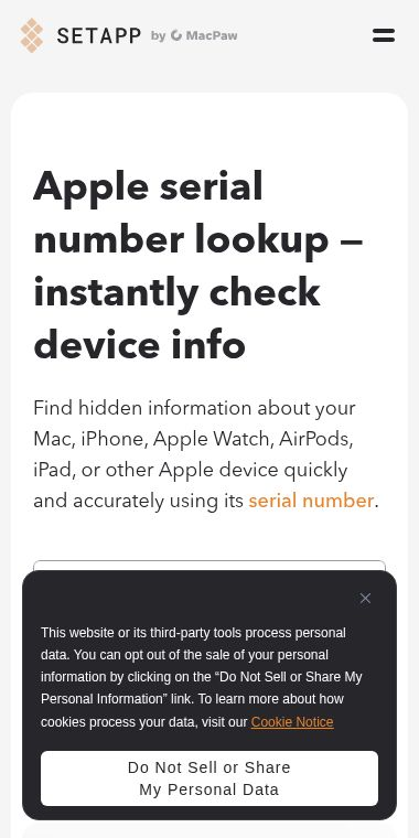 This is a super handy and free online tool from Setapp that lets you quickly check the basic details of any Apple device using its serial number. It's like a quick ID check for your Mac, iPhone, or iPad.