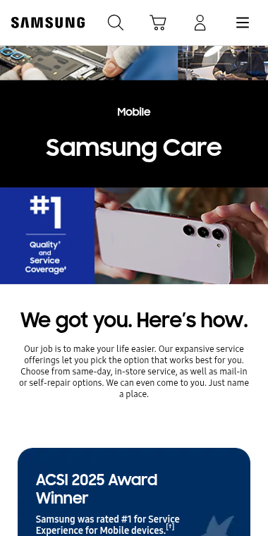 h2: ACSI 2025 Award Winner,Convenience,Quality,Speed & Competitive pricing,Samsung Account,Premium Support with Samsung Care+,Walk-in Service,We come to you,Mail-in service,Partnering Locations,Self-Repair,Move toward a greener future,2024 Winner,Contact Samsung Support,Footer Navigation
