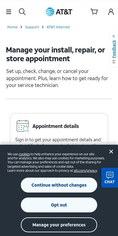 h1: Manage your install, repair, or store appointment h2: Appointment details,Installation,Repair,AT&T store,FREQUENTLY ASKED QUESTIONS,Did you get the help you needed? nav_tags: Personal,Business,Find a store,Ver en español content: