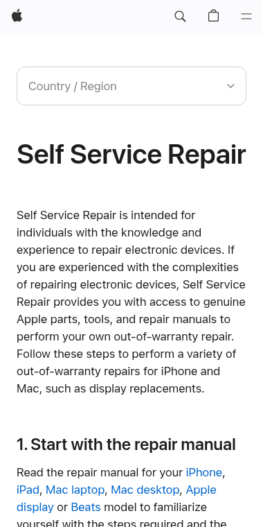 This is Apple's official spot for people who want to fix their own Apple gear. It's all about giving you the tools and info to do repairs yourself, right at home.