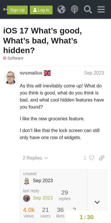 Specifically, this page is a long-running discussion thread all about iOS 17. Users share their favorite new features, complain about bugs and annoyances, and point out neat hidden tricks they’ve discovered, creating a comprehensive crowdsourced guide.